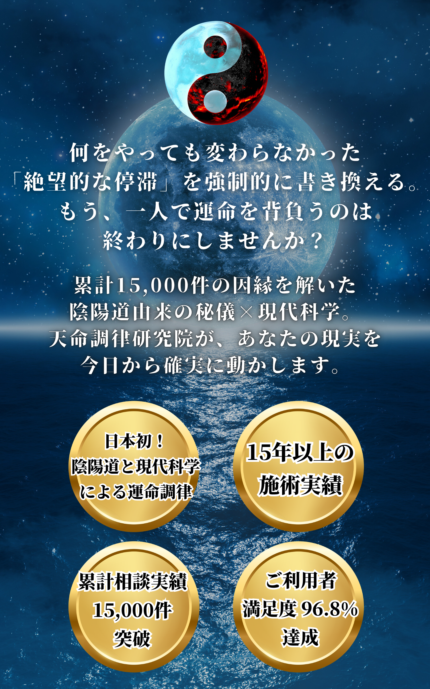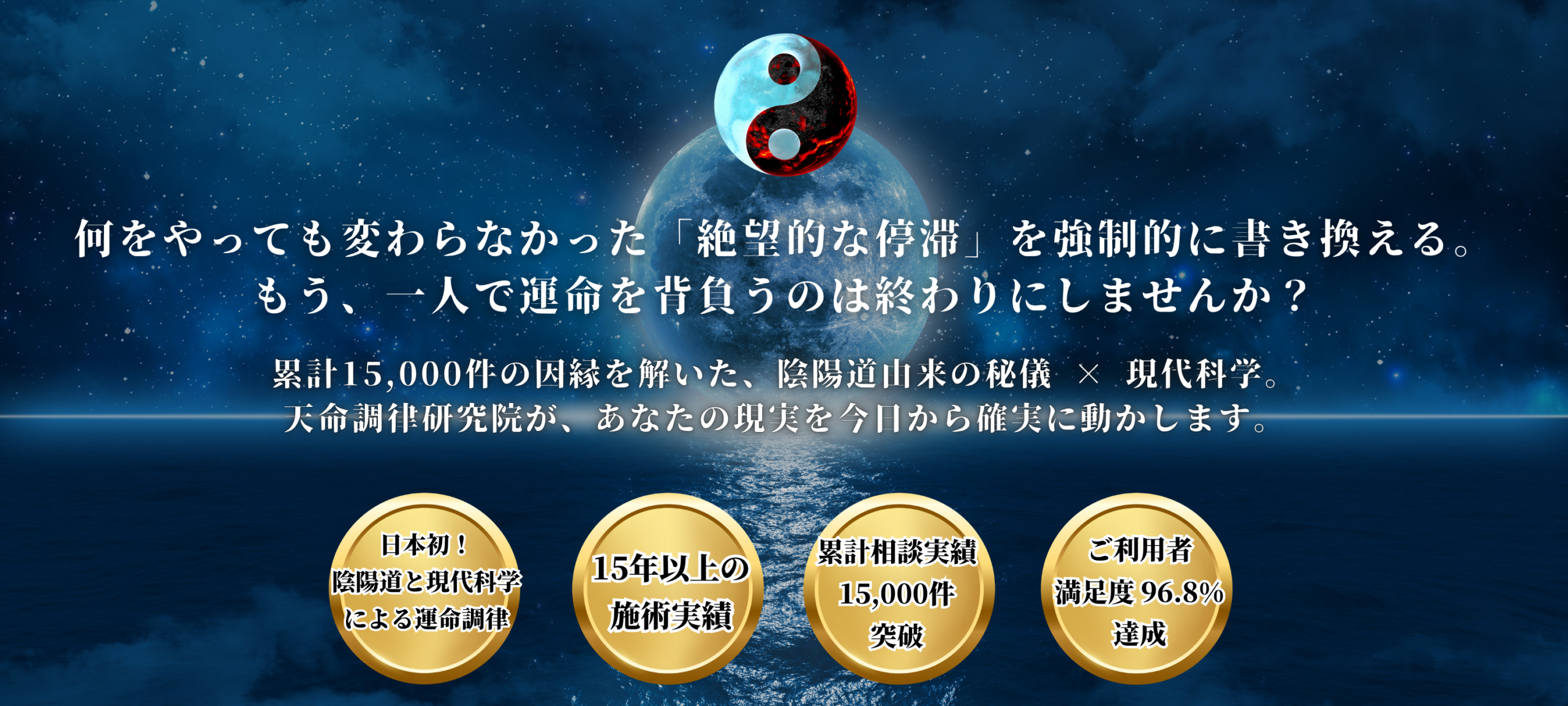 天命調律研究院では、日本古来の秘術である陰陽道(日本古来から伝わる伝統的な呪術の種類です。)と心理学や量子力学(私たちの現実世界で起きる現象を、エネルギーのレベルで制御し変化させる理論)を掛け合わせた日本初の組織です。